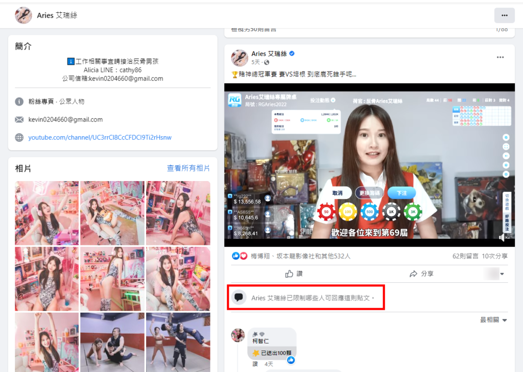 旗下艾瑞絲、培根等人,卻於6/15代言一間非法線上博弈,